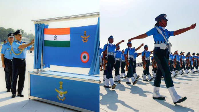 भारतीय वायु सेना की स्थापना 8 अक्टूबर 1932 को हुई थी. दूसरे विश्व युद्ध के दौरान वायुसेना की ताकत को देखते हुए मार्च 1945 में फोर्स को ‘रॉयल’ उपाधि दी गई, जिसके बाद Royal Indian Air Force (RIAF) नाम मिला। इसके बाद साल 1950 में जब भारत एक गणतंत्र बना तो IAF ने ‘रॉयल’ उपाधि हटा दी और फ्लैग में संशोधन किया। इसको बदलकर IAF फ्लैग बनाया गया था। IAF ने एक बयान में कहा कि एयरफोर्स का अब एक नया फ्लैग तैयार किया गया है। इस पर राष्ट्रीय चिन्ह के साथ ही अशोक स्तंभ और देवनागल्गगोलरी में ‘सत्यमेव जयते’ लिखा है। अशोक स्तंभ के नीचे एक ईगल है, जिसके पंख फैले हुए नजर आ रहे है।