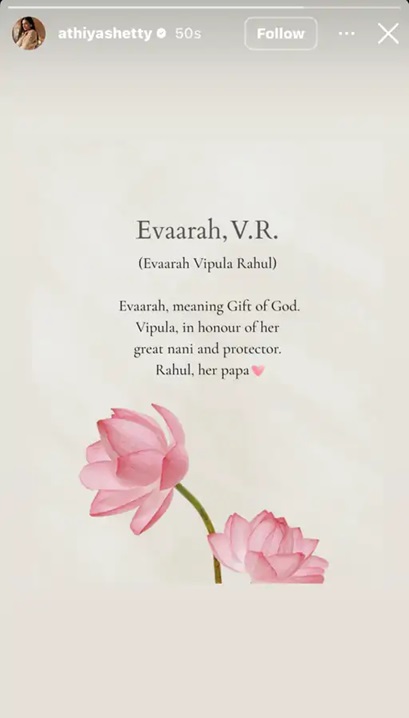 अथिया शेट्टी ने अपने पति और क्रिकेटर केएल राहुल के बर्थडे के मौके पर बेटी का नाम अनाउंस किया है। अथिया ने पोस्ट के कैप्शन में लिखा, हमारी बेबी गर्ल, हमारी सबकुछ है। इवारा- गिफ्ट ऑफ गॉड। अथिया ने इंस्टाग्राम पर एक स्टोरी शेयर कर बेटी के नाम का मतलब भी बताया है। कपल की बेटी का पूरा नाम इवारा विपुला राहुल है। इवारा का मतलब गिफ्ट ऑफ गॉड, विपुला- अथिया की नानी के सम्मान में और राहुल इवारा के पापा।