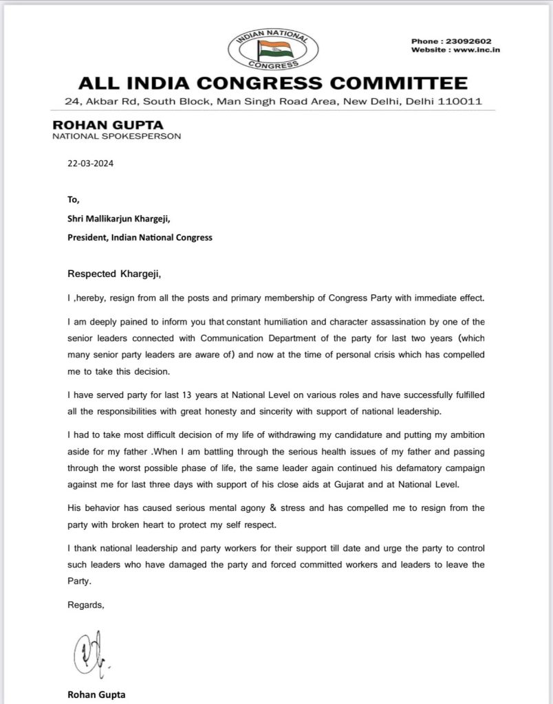 सोशल मीडिया X पर पोस्ट किए गए चिट्ठी में लिखा है ‘मैं तत्काल प्रभाव से कांग्रेस पार्टी के सभी पदों और प्राथमिक सदस्यता से इस्तीफा देता हूं। मुझे यह बताते हुए दुख हो रहा है कि पिछले दो वर्षों से पार्टी के संचार विभाग से जुड़े एक वरिष्ठ नेता द्वारा लगातार अपमान और चरित्र हनन किया जा रहा है। अब व्यक्तिगत संकट के समय में मुझे यह (इस्तीफा) निर्णय लेने के लिए मजबूर किया।’