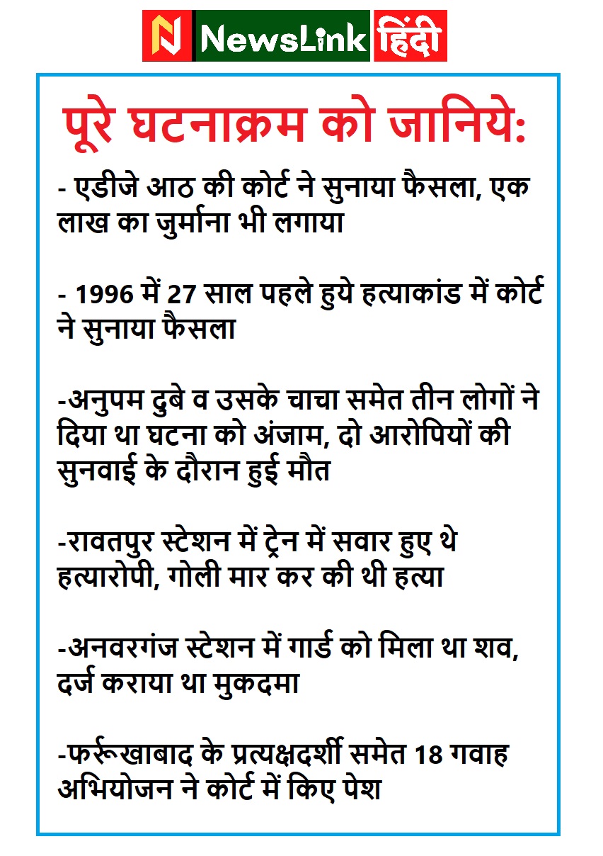 डीजीसी क्रिमनल दिलीप कुमार अवस्थी ने बताया कि 14 मई 1996 को अनवरगंज स्टेशन में पैसेंजर ट्रेन में आर्थिक अपराध शाखा में तैनात इंस्पेक्टर राम निवास यादव की गोली मार कर हत्या कर दी गई थी। ट्रेन के गार्ड आरके बाजपेई की ओर से बसपा नेता अनुपम दुबे उसके चाचा कौशल दुबे व नेम कुमार उर्फ बिलैया के खिलाफ हत्या की रिपोर्ट दर्ज कराई गई थी। वर्ष 2021 में एडीजे आठ राम अवतार प्रसाद की कोर्ट के समक्ष आया, जिसके बाद मामले ने तेजी पकड़ी। गुरुवार को घटना के 27 साल बीतने के बाद कोर्ट ने आरोपी बसपा नेता अनुपम दुबे को घटना का दोषी पाते हुए आजीवन कारावास व एक लाख अर्थदंड की सजा सुनाई। वहीं सुनवाई के दौरान कौशल दुबे व नेम कुमार उर्फ बिलैया की मौत हो गई। डीजीसी क्रिमनल ने बताया कि मामले में घटना के प्रत्यक्षदर्शी मुलायम सिंह समेत 18 गवाह कोर्ट में पेश किए गए, जिन्होंने बसपा नेता के खिलाफ बयान दिए।