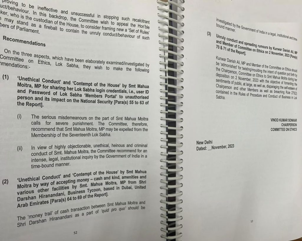 रिपोर्ट पेश होने के बाद संसद में विपक्षी सांसदों ने जमकर हंगामा किया और नारे लगाए। आइए अब आपको एथिक्स कमेटी की रिपोर्ट की कॉपी के वो दो पेज दिखाते हैं जिसमें महुआ मोइत्रा को निष्कासित करने की सिफारिश की गई है। एथिक्स पैनल की रिपोर्ट में कहा गया है कि, ‘महुआ मोइत्रा ने जो गंभीर काम किए हैं उसके लिए कड़ी सजा की जरूरत है। इसलिए, समिति सिफारिश करती है कि सांसद महुआ मोइत्रा को सत्रहवीं लोकसभा की सदस्यता से निष्कासित किया जाए।’