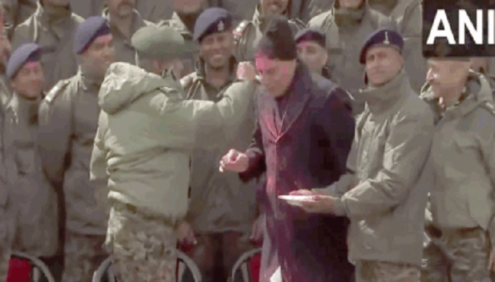 #WATCH | Ladakh: Defence Minister Rajnath Singh celebrates #Holi with Armed Forces Personnel, at Leh Military Station. pic.twitter.com/dU4Q2Rq31c