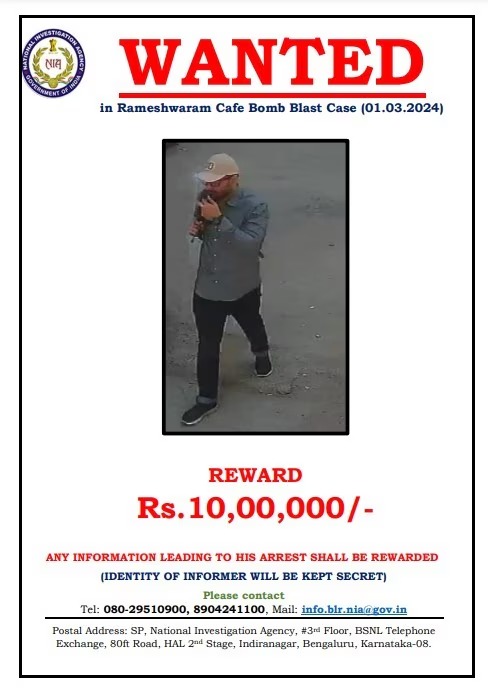 रामेश्वरम कैफे ब्लास्ट मामले में NIA ने कैफे में बम रखने वाले आरोपी पर रखा 10 लाख का इनाम, फोटो भी की जारी