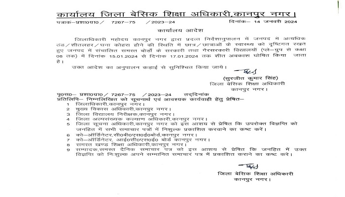 न्यूज़लिंक हिंदी। कानपुर में ठंड व कोहरे को देखते हुए जिलाधिकारी के निर्देश पर बेसिक शिक्षा अधिकारी सुरजीत कुमार सिंह ने आठवीं तक के सभी बोर्ड के स्कूल 17 जनवरी तक बंद करने के दिए निर्देश।