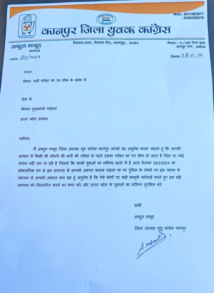 कानपुर जिला युवक कांग्रेस कमेटी के जिला अध्यक्ष अब्दुल मबूद ने बताया कि वर्तमान की सरकार जब भी युवाओं को रोजगार या सरकारी नौकरी देने की भर्ती निकलती है और परीक्षा भी करती है लेकिन परीक्षा होने के तुरंत बाद पेपर लीक हो जाता है। जिससे युवाओं के भविष्य को खतरा मंडराने लगता है। उसके बाद सरकार उन परीक्षाओं को रद्द कर देती है जिससे युवाओं द्वारा अरबो रुपए काफी नुकसान होता है। जिस पर सरकार पेपर लीक करने वालों पर लगाम नहीं लग पा रही है। जिसको लेकर आज कानपुर जिला यूथ कांग्रेस के लोगों ने मुख्यमंत्री आवास का घेराव कर उनको ज्ञापन देकर पेपर लीक करने वालों पर लगाम लगाने की गुजारिश करने जा रही थी।