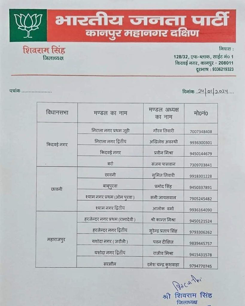 Kanpur : दक्षिण क्षेत्र के 13 नये मंडल अघ्यक्षों की सूची जारी, जिलाध्यक्ष शिवराम सिंह ने कही ये बात…