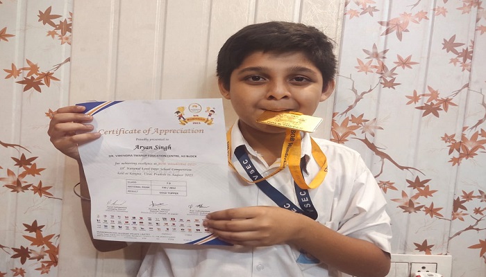 न्यूजलिंक हिंदी। नेशनल लेवल इंटर स्कूल कॉम्पटीशन (National Level Inter School Competition) में वीरेंद्र स्वरूप किदवई नगर के छात्र आर्यन सिंह को गोल्ड मैडल मिला। अलग-अलग स्कूलों के बीच हुए कॉम्पटीशन में आर्यन ने अच्छा प्रदर्शन कर गोल्ड पर कब्जा किया। लाजपत भवन में आयोजित कार्यक्रम में प्रथम आए आर्यन सिंह को मैडल और सर्टिफिकेट देकर सम्मानित किया गया।