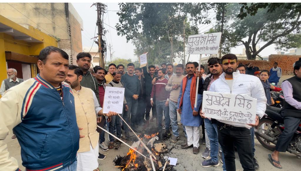 न्यूज़ लिंक हिंदी, मथुरा। क्षत्रिय महासभा द्वारा राजपूत करणी सेना के प्रदेश अध्यक्ष सुखदेव गोगामेड़ी की हत्या के विरोध में क्षत्रिय महासभा ने कई जगह प्रदर्शन किया और पुतले फूंके। वृंदावन में एक रैली राधाकृष्ण धाम से लेकर परिक्रमा मार्ग तक निकाली गई। छाता में भी प्रदर्शनकारियों ने ज्ञापन दिया। वृन्दावन क्षत्रिय महासभा के पदाधिकारी एवं राजपूत जाति के लोगों ने बढ़ चढ़कर हिस्सा लिया एवं हमलावरों की गिरफ्तारी एवं एनकाउंटर की मांग की गई।