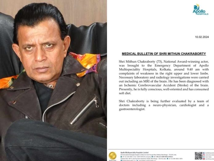 मिथुन चक्रवर्ती को अस्पताल में Ischemic Cerebrovascular Accident (स्ट्रोक) आया जिसका सीधा कनेक्शन ब्रेन से है। फिलहाल उनका इलाज जारी है और वह होश में हैं। अस्पताल की ओर से कहा जा रहा है कि अभिनेता मिथुन चक्रवर्ती को दाहिनी ओर ऊपरी और निचले अंगों में थोड़ी कमजोरी महसूस हो रही थी जिसके बाद सुबह 9.40 बजे उन्हें कोलकाता के अपोलो अस्पताल के इमरजेंसी डिपार्टमेंट में दाखिल किया गया था। वहां दिमाग की एमआरआई सहित अन्य जरूरी टेस्ट और रेडियोलॉजी टेस्ट भी हुए। उन्हें ब्रेन का Ischemic Cerebrovascular Accident (स्ट्रोक) आया है। फिलहाल वह हल्का खाना खा रहे हैं।’
