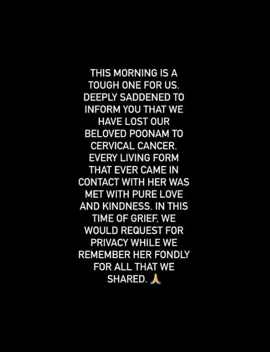 पूनम पांडे के इंस्टाग्राम अकाउंट पर शेयर किए गए पोस्ट में लिखा है, “यह सुबह हमारे लिए कठिन है। आपको यह बताते हुए बहुत दुख हो रहा है कि हमने सर्वाइकल कैंसर के कारण अपनी प्यारी पूनम को खो दिया है। उनके कॉन्टेक्ट में आने वाला हर इंसान उनसे प्यार से मिला। दुःख की इस घड़ी में, हम प्राइवेसी की रिक्वेस्ट करेंगे। हम उन्हें हमारे द्वारा शेयर की गई हर बात के लिए प्रेमपूर्वक याद करेंगे।”