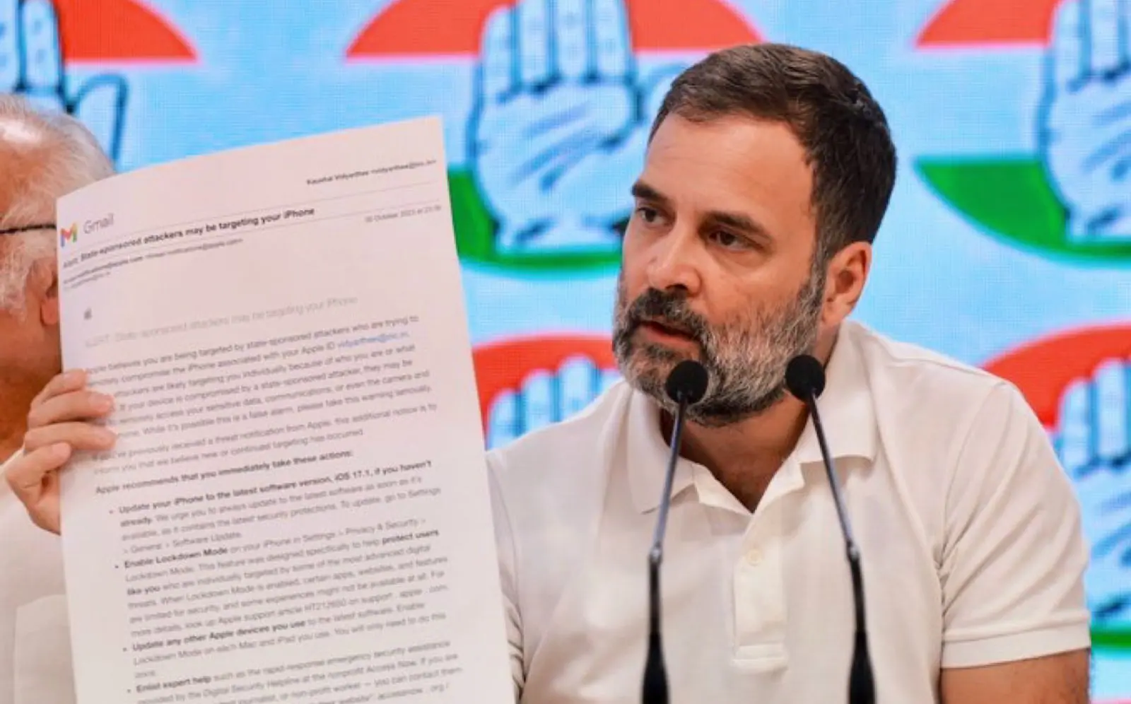 राहुल गांधी ने प्रेस कॉन्फ्रेंस में Apple की तरफ से आए ईमेल की प्रिंटेड कॉपी दिखाते हुए कहा, ‘पूरे विपक्ष के खिलाफ Apple का नोटिस आया है। पूरे विपक्ष के खिलाफ Apple का नोटिस आता है। यह मेरे कार्यालय में सभी लोगों को मिला है। कांग्रेस पार्टी में लिस्ट बनी हुई है। यह सारे किसी न किसी तरीके से इस मामले में शामिल हैं। आपका ध्यान कभी इधर, कभी उधर ले जाते हैं, आपके दिल में गुस्सा पैदा करते हैं और जब आपके अंदर नफरत आती है तब ये लोग इस देश का धन ले जाते हैं। यह नोटिस वेणुगोपाल, पवन खेड़ा, सीताराम येचुरी, अखिलेश यादव, सुप्रिया, प्रियंका चतुर्वेदी, महुआ मोइत्रा, राघव चड्ढा, इन सबको मिला है। ये सब अडानी के खिलाफ आवाज उठाते हैं। पूरा इंफ्रास्ट्रक्चर अडानी को दे दिया। जितनी टैपिंग करनी है, कर लो। मुझे कोई फर्क नहीं पड़ता।’