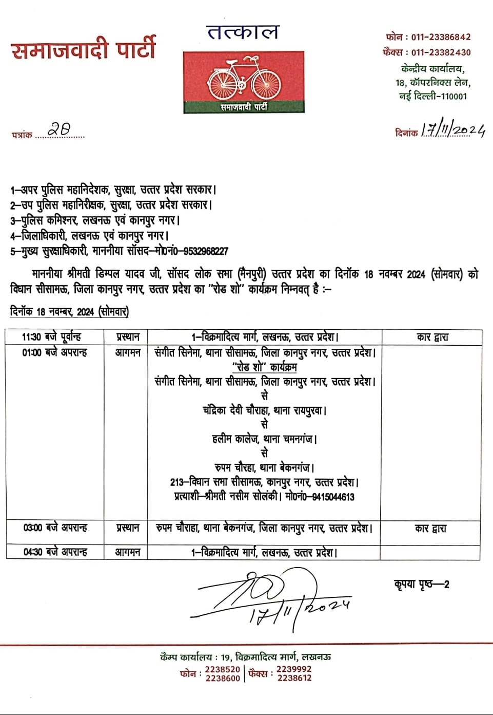 बृजेन्द्र स्वरूप पार्क से कमिश्नर बंगला चौराहा-ग्वालटोली थाना ग्वालटोली बाजार- बकरमंण्डी बजरिया थाना – रामबाग चौराहे से ब्रम्हनगर चौराहा- नेहरू नगर होता हुआ चुन्नीगंज चौराहा, द्वारिकापुरी बस्ती, जीटी रोड से बॉये मुड़कर जरीब चौकी हीरागंज बाजार, स्व. श्याम बिहारी मिश्रा के आवास के सामने से होता हुआ जीटी रोड से अफीम कोठी चौराहा, डिप्टी पडाव चौराहा, चंद्रिकादेवी चौराहा-रायपुरवा थाने के सामने रामलीला ग्राउंड पर रोड शो समाप्त होगा।