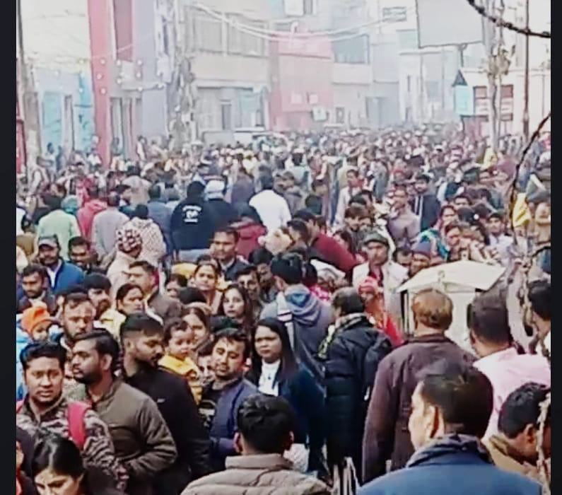 न्यूजलिंक हिंदी,वृंदावन। विश्व प्रसिद्ध ठाकुर बांके बिहारी मंदिर में क्रिसमस वाले दिन भी भारी भीड़ उमड़ पड़ी। श्रद्धालुओं की संख्या में इजाफा होता चला जा रहा है। रविवार को लाइन में लगी दो महिला श्रद्धालुओं की मौत तबीयत खराब होने के कारण प्रशासन द्वारा रेलिंग लगाकर भीड़ को नियंत्रित करने का प्रयास किया गया। इसी क्रम में लगभग 2 किलोमीटर तक लंबी लाइन श्रद्धालुओं की देखने को मिली।ठाकुर बांके बिहारी मंदिर में सोमवार को सुबह से ही भक्तों की भारी भीड़ अपने आराध्य ठाकुर बांके बिहारी के दर्शन करने के लिए नगर के प्रमुख चौराहों पर देखने को मिली, वहीं पूरे वृंदावन शहर में जाम की स्थिति पैदा हो गई ।