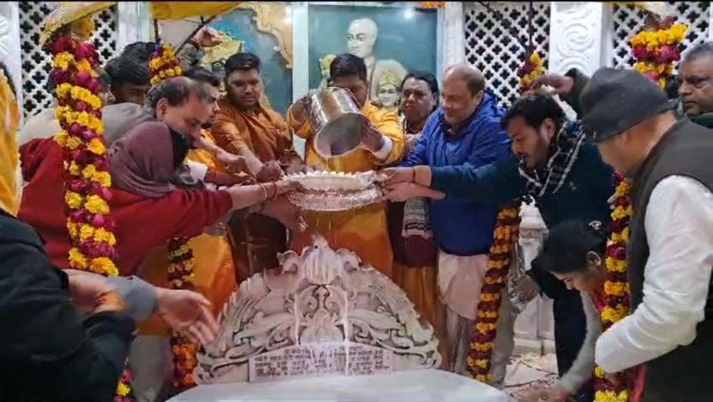 - ब्रह्म मुहूर्त में निधिवन मंदिर में स्थित प्राकट्य स्थली का हुआ पंचामृत से अभिषेक
